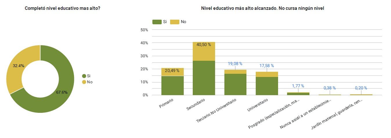 Sin embargo, el dato educativo genera un desafío. Si bien las oportunidades de formación son valoradas positivamente por el 86.7% de los encuestados, el informe revela que entre la población que ya no estudia, el 40.5% tiene el nivel Primario como máximo nivel alcanzado. Esto contrasta con la necesidad de mano de obra calificada y subraya la urgencia de programas de terminalidad educativa y capacitación, a pesar de que casi un 37% sí completó o accedió a niveles Terciarios o Universitarios.